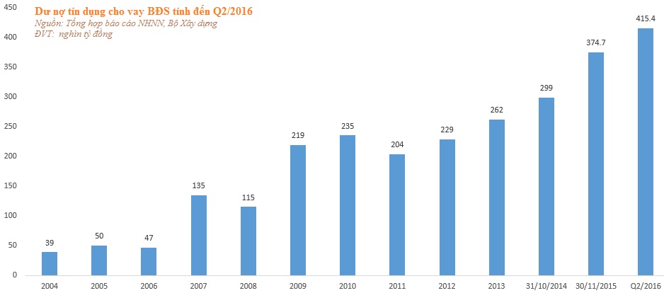 Theo số liệu từ Vụ Tín dụng (NHNN), cho thấy tín dụng bất động sản trong những năm qua liên tục tăng, tính đến giữa quý 2/2016 dư nợ cho vay kinh doanh bất động sản trên 415.000 tỷ đồng. Như vậy, so với con số cách đây 5 năm (2012) khoảng 197.000 tỷ đồng thì các ngân hàng đã “bơm” vào BĐS khoảng trên 200 nghìn tỷ đồng (gần 10 tỷ USD), tăng trưởng 100%.